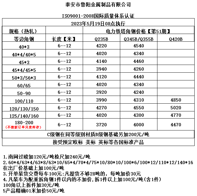 • 5月30日唐山龙翔角钢价格调价信息出厂价格