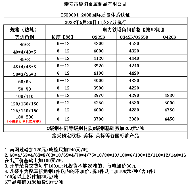 • 5月30日唐山龙翔角钢价格调价信息出厂价格