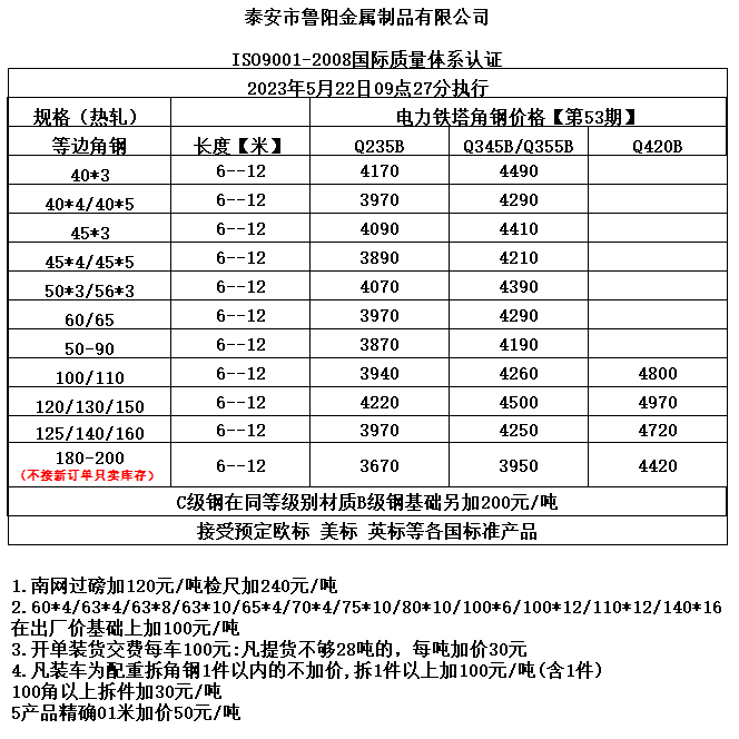 • 泰安市鲁阳型钢第53期价格政策