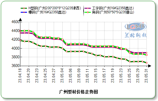 据兰格云商平台监测数据显示:今日广州市场鑫达产16#工字钢价格为3880元,降20元;唐山产16#槽钢价格为3850元,降20元;唐山产5#角钢价格为3850元,降20元;津西产200×200H型钢价格为 3670元,降30元。