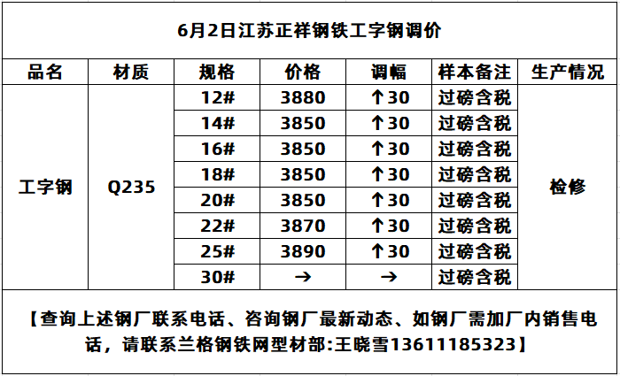 • 6月2日(9点)唐山型材钢厂工字钢实时调价汇总