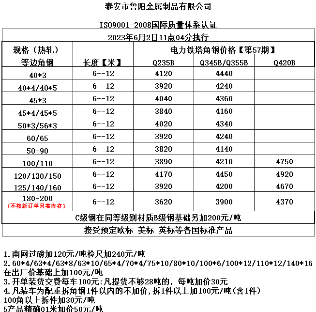 泰安市鲁阳型钢第57期价格政策