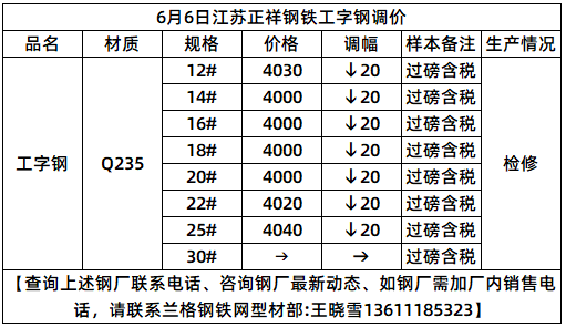 6月6日江苏正祥钢铁工字钢调价