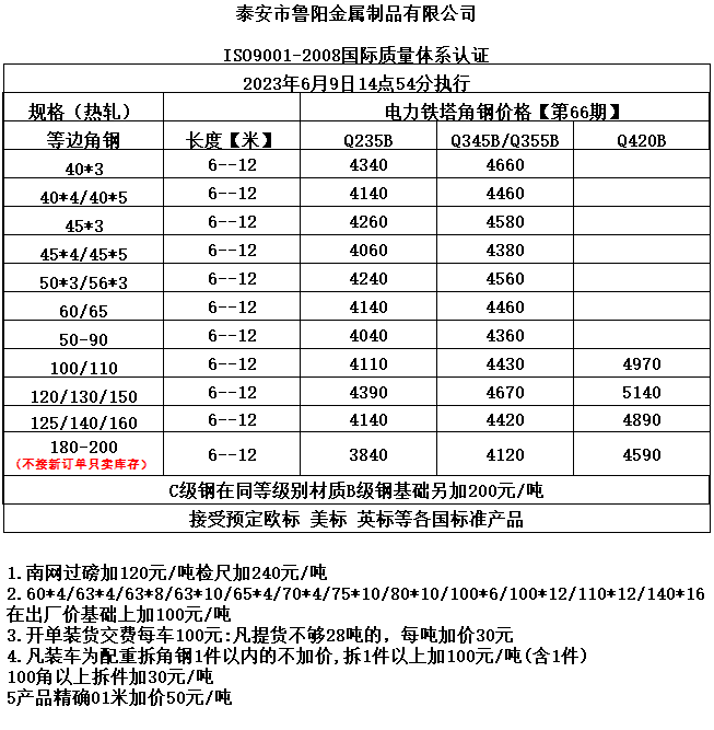 • 6月14日唐山龙翔角钢价格调价信息出厂价格