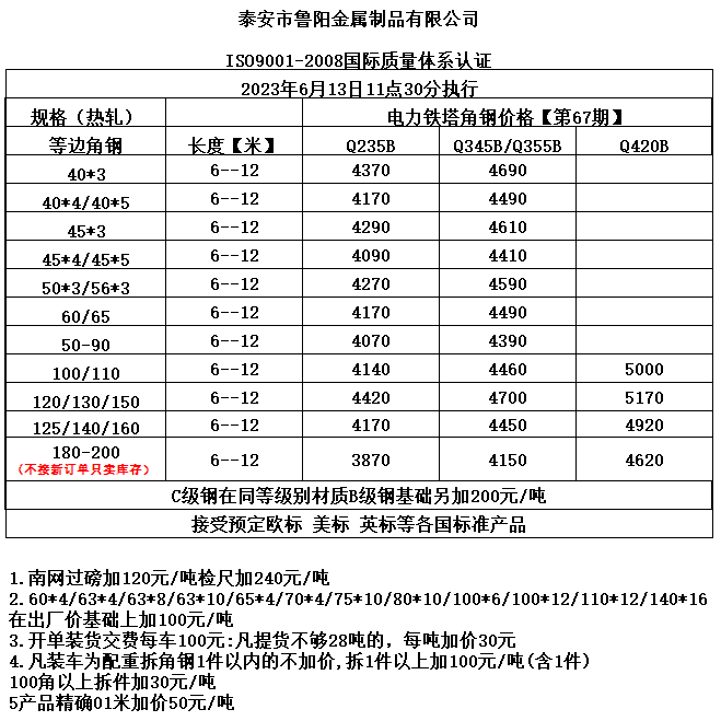 • 6月14日唐山龙翔角钢价格调价信息出厂价格
