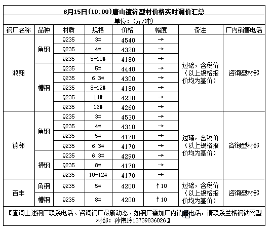 • 6月15日(9:30)唐山型钢厂角钢实时调价汇总