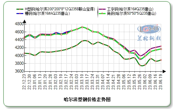据兰格云商平台监测数据显示:今日哈尔滨市场16#工字钢价格为4240元;16#A槽钢价格为4170元;5#角钢价格为4170元;200×200H型钢价格为3890元(国标检尺价格)。