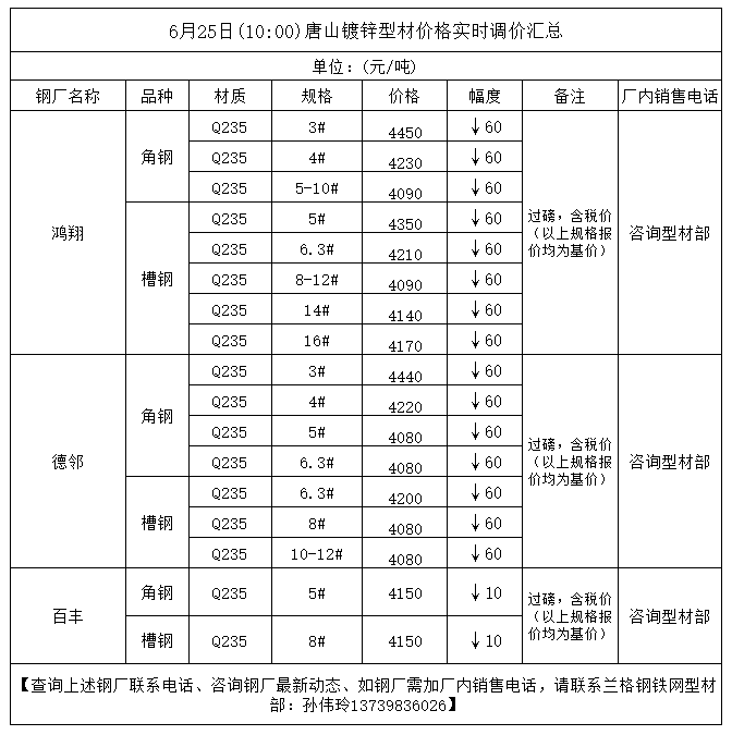 • 6月25日(10:00)唐山镀锌型材价格实时调价汇总
