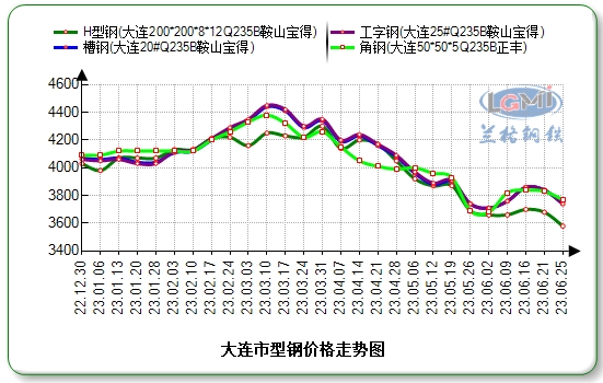 据兰格云商平台监测数据显示:今日大连市场25#工字钢价格为3740元;20A#槽钢价格为3740元;5#角钢价格为3770元;200×200H型钢价格为3580元。