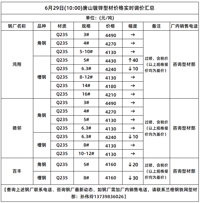 • 6月29日(9:30)唐山型钢厂角钢实时调价汇总
