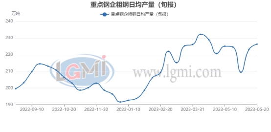 6月份以来,由于经济数据表现不佳,政策端利好不断加码,情绪面利好带动了国内钢材市场的震荡反弹,钢企盈利获得一定修复,钢铁企业生产释放力度呈现较强的韧性。据兰格钢铁网调研数据显示,6月份全国百家中小钢企高炉开工率的均值为79.6%,与5月份基本持平,进而也带来了粗钢产量的回升,据中国钢铁工业协会统计数据显示,6月中旬重点钢企粗钢日均产量226.27万吨,环比增长1.42%,同比增长0.21%。