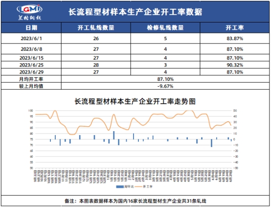 长流程钢厂方面,截至发稿,兰格钢铁网统计国内16家长流程样本生产企业共31条型钢轧线,在产27条,停产4条,开工率为87.1%,月均开工率为87.1%,较上月均值下降9.67%;轧钢企业方面,唐山24家样本轧钢企业共37条轧线,在产11条,停产26条,开工率为29.73%;月均开工率为53.38%,较上月均值涨4.73%。