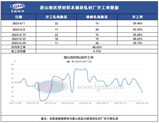 2、唐山型材轧钢企业开工率较上月相比有小幅回涨,长流程生产企业开工率与上月相比稍有回落