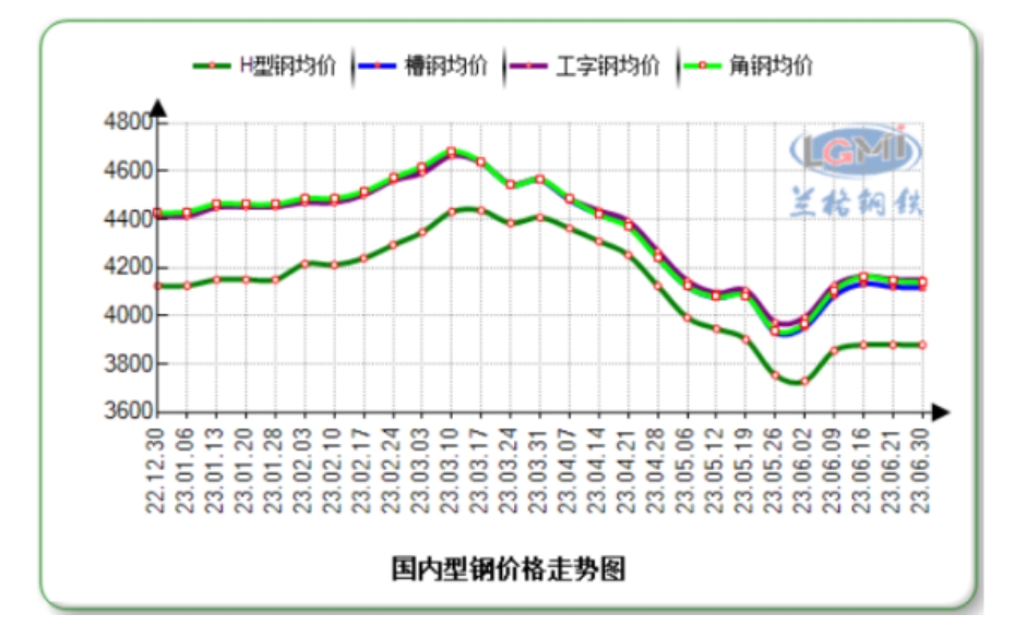 截至6月30日,国内市场25#工字钢平均价格为4088元,较上周同期价格涨32元;25#槽钢平均价格为4173元,较上周同期价格涨32元;5#角钢均价为4046元,较上周同期价格涨32元;200×200H型钢平均价格为3761元,较上周同期价格涨32元。