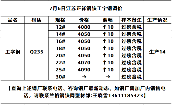 • 7月6日唐山玉田祥泰钢厂工字钢调价信息