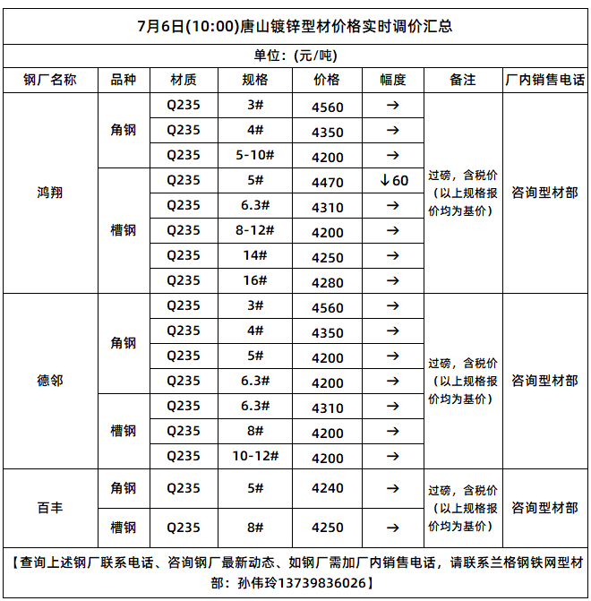 7月6日(10:00)唐山镀锌型材价格实时调价汇总