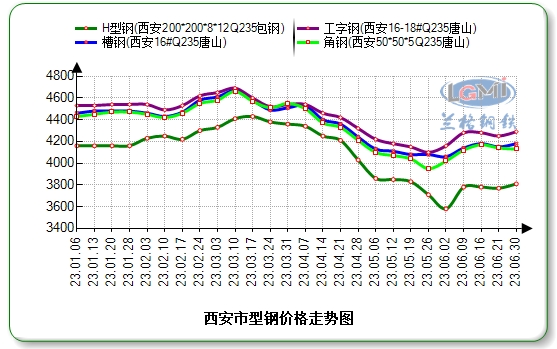 兰格钢铁云商平台监测数据显示:西安市场16-18#工字钢价格为4310元;16#槽钢价格为4180元;5#角钢价格为4170元;200*200H型钢价格为3820元。