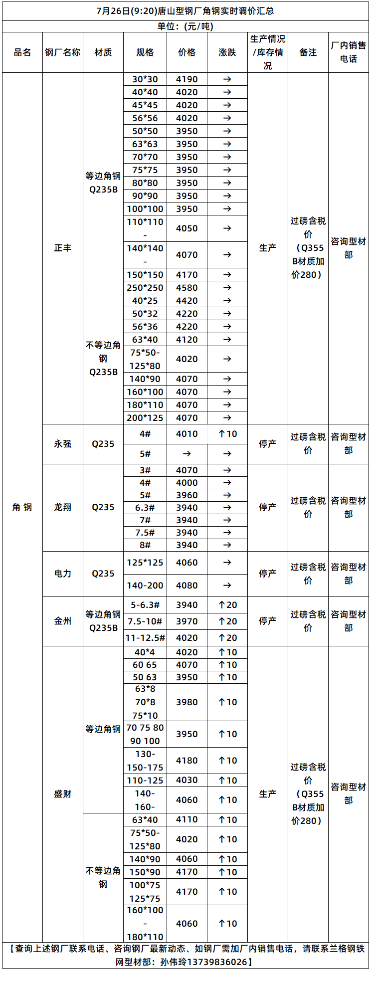 • 7月26日(9:20)唐山型钢厂角钢实时调价汇总
