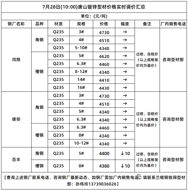 • 7月28日(9:00)唐山型钢厂角钢实时调价汇总