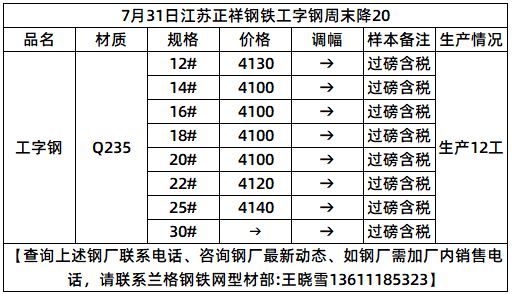 • 7月31日江苏正祥钢铁工字钢周末降20