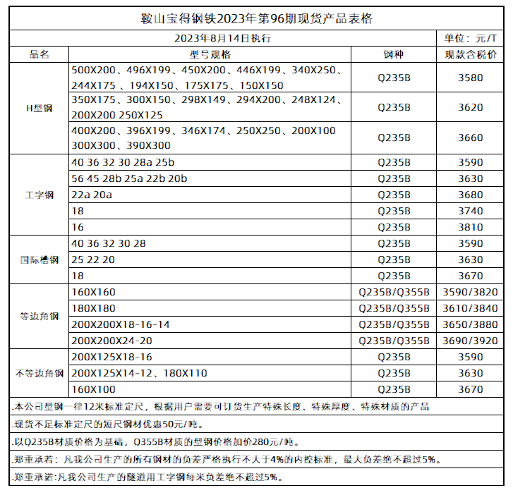 • 鞍山宝得钢铁2023年第96期现货产品表格