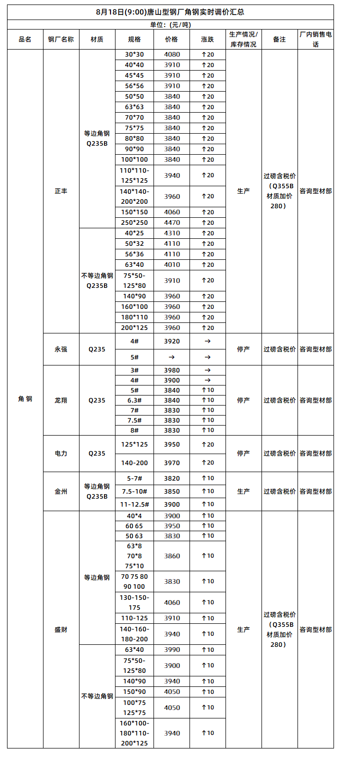 8月18日(9:00)唐山型钢厂角钢实时调价汇总