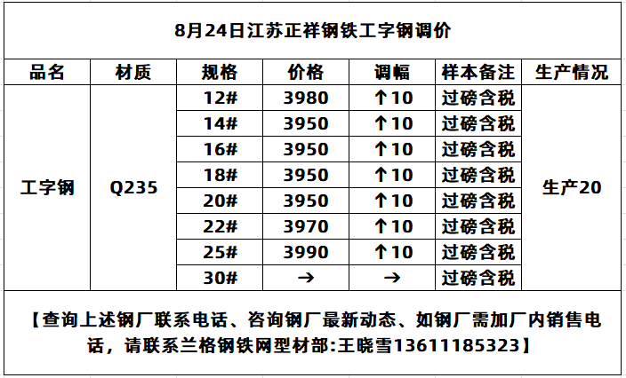 • 8月24日唐山玉田祥泰钢厂工字钢调价信息