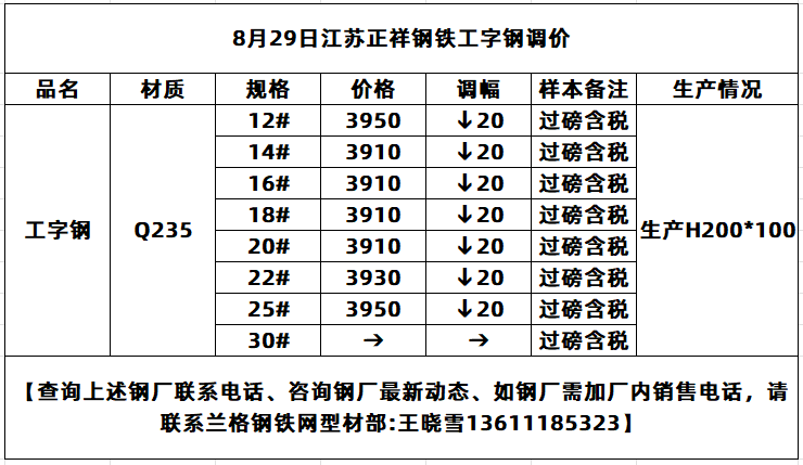• 8月29日唐山玉田祥泰钢厂工字钢调价信息