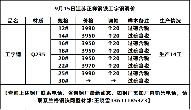 • 9月15日唐山玉田祥泰钢厂工字钢调价信息