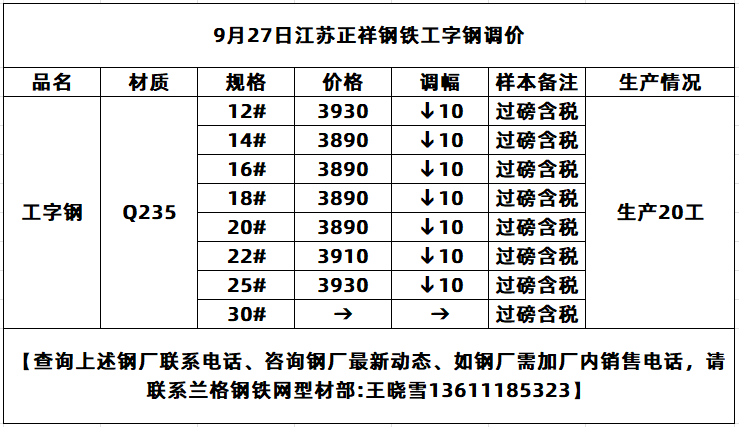 • 9月27日唐山盛财钢厂槽钢调价信息