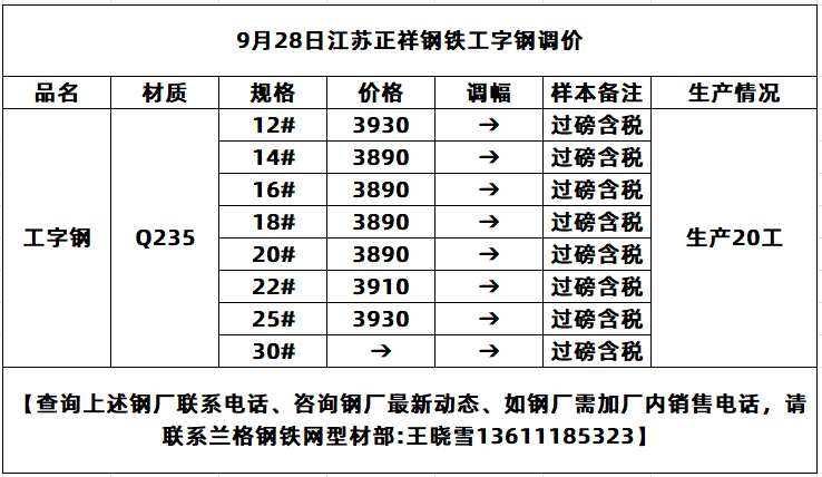 • 9月28日江苏正祥工字钢出厂挂牌价维稳