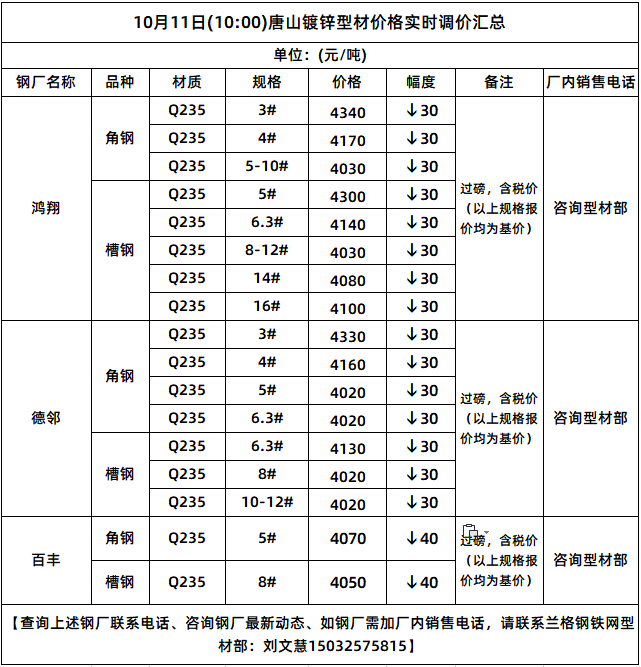 • 10月11日(10:00)唐山镀锌型材价格实时调价汇总
