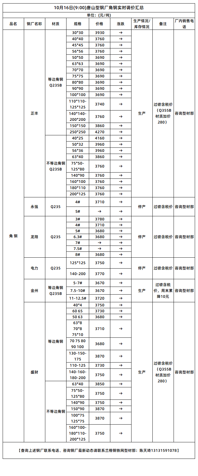 10月16日(9:00)唐山型钢厂角钢实时调价汇总
