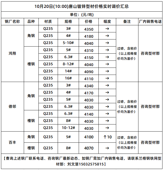 10月20日(10:00)唐山镀锌型材价格实时调价汇总