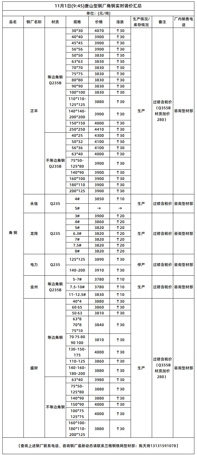 11月1日(9:45)唐山型钢厂角钢实时调价汇总
