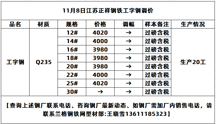 11月8日江苏正祥工字钢价格持稳