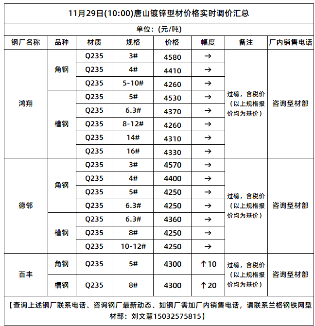 11月29日(10:00)唐山镀锌型材价格实时调价汇总