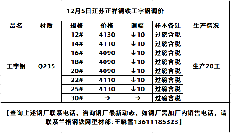 • 12月5日江苏正祥工字钢价格降10元