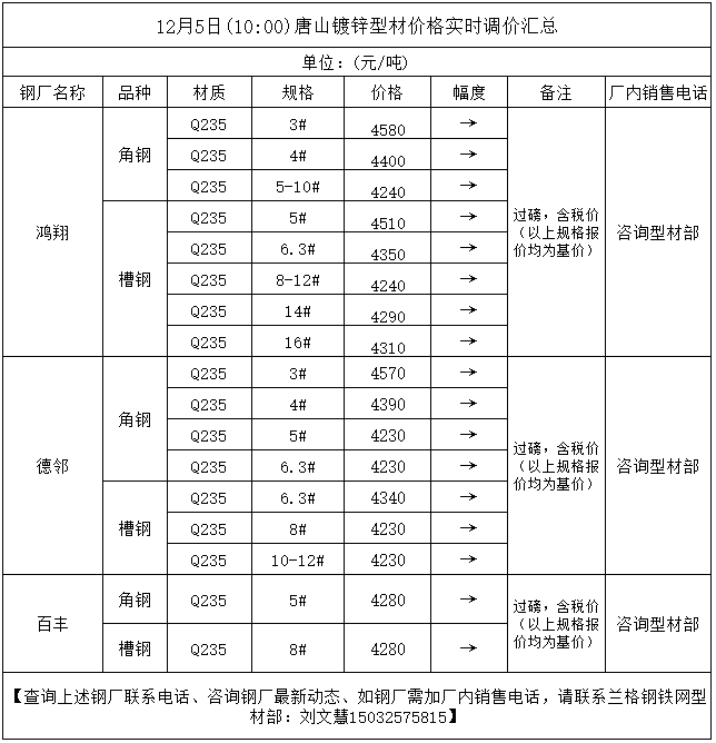 • 12月5日(10:00)唐山镀锌型材价格实时调价汇总