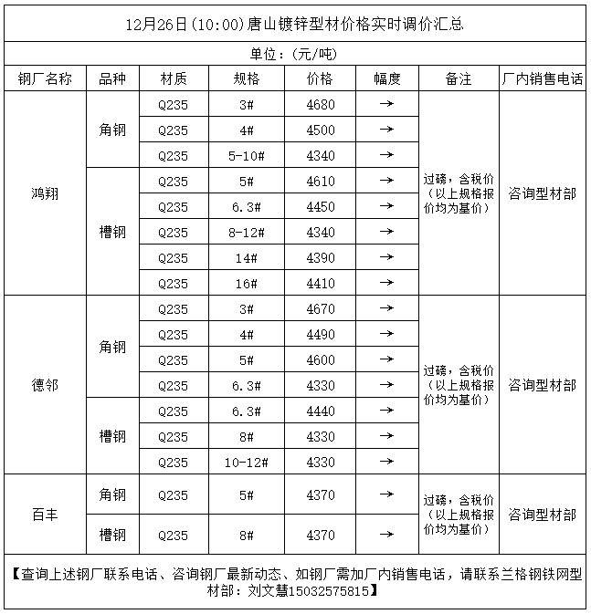 • 12月26日(09:30)唐山型钢厂角钢实时调价汇总