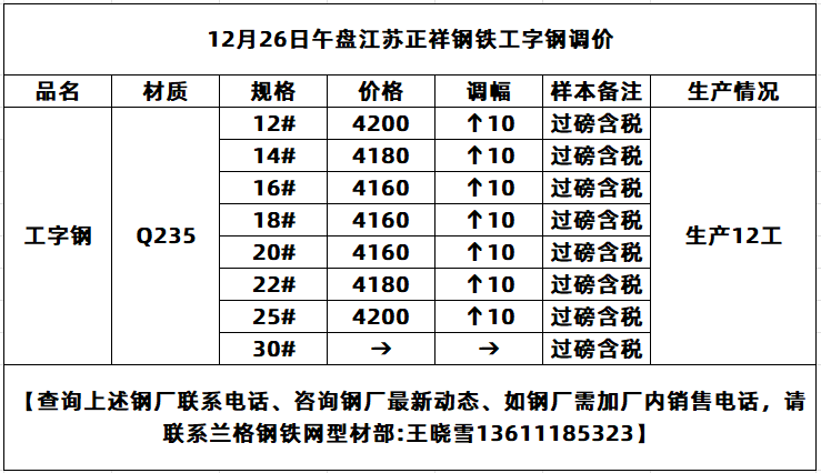 12月26日午盘江苏正祥工字钢价格涨10元