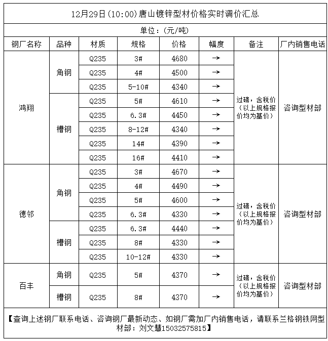 12月29日(10:00)唐山镀锌型材价格实时调价汇总