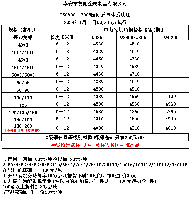 • 1月11日(12:06)唐山电力钢厂角钢调价信息