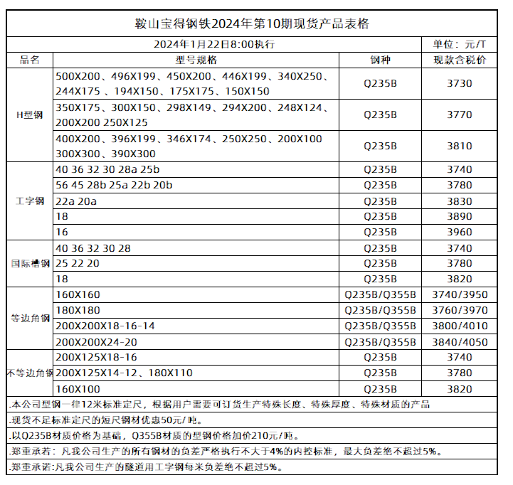 • 鞍山宝得钢铁2024年第10期现货产品表格