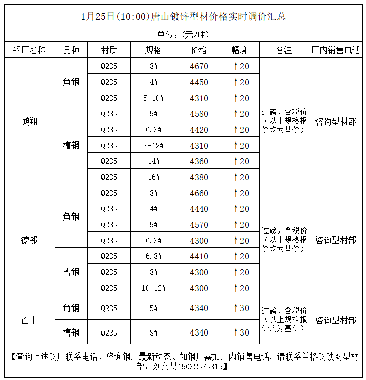 • 1月25日(10:00)唐山镀锌型材价格实时调价汇总