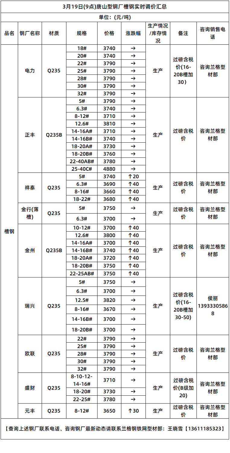 • 3月19日(9点)唐山型钢厂槽钢实时调价汇总