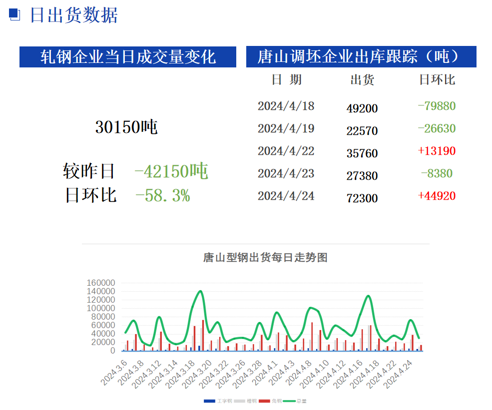 兰格调研:据统计截止15:30唐山24家型材钢厂出货总量约30150吨,较昨日降幅58.3%,其中工字钢5000吨;槽钢10750吨;角钢14400吨。