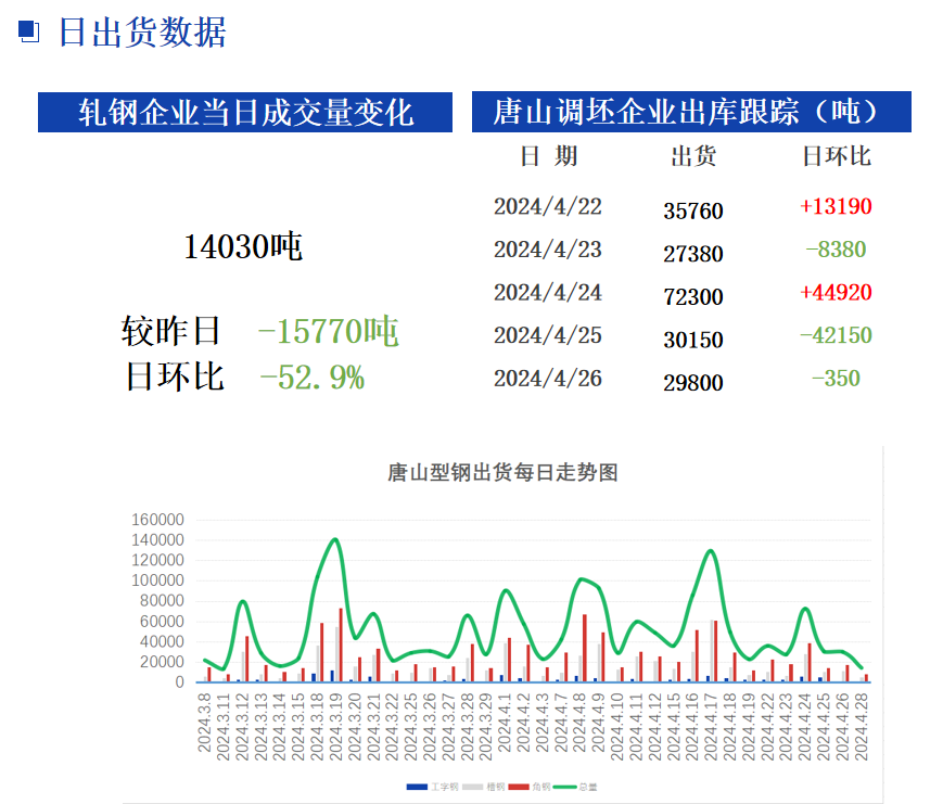 兰格调研:据统计截止15:30唐山24家型材钢厂出货总量约14030吨,较昨日降幅52.9%,其中工字钢700吨;槽钢4930吨;角钢8400吨。