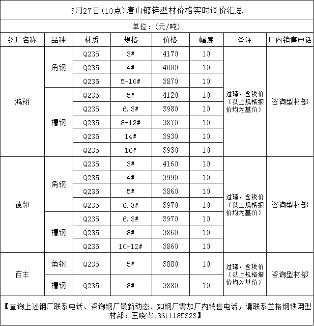 • 6月27日(9点)唐山型钢厂角钢实时调价汇总