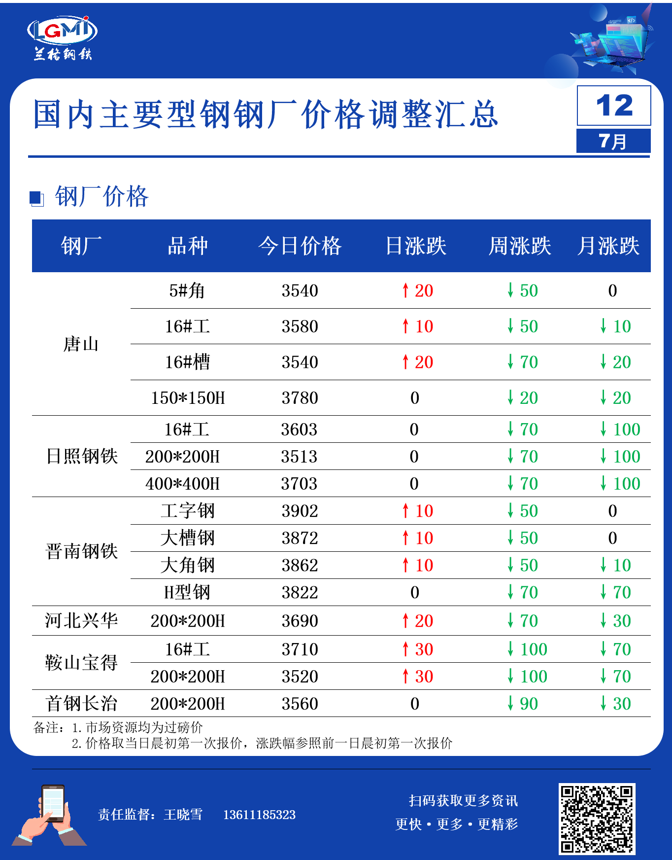 • 7月12日(13点)唐山型钢厂槽钢实时调价汇总